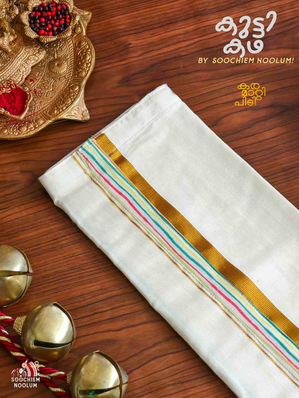 Introducing the vibrant Kids' Dhoti Collection by Kutti Kadha from Soochiem Noolum, specially crafted to blend tradition and comfort for energetic little ones. Each dhoti is meticulously designed from soft cotton fabric and beautifully adorned with colorful stitched borders and elegant embellishments, adding a playful charm to traditional attire.