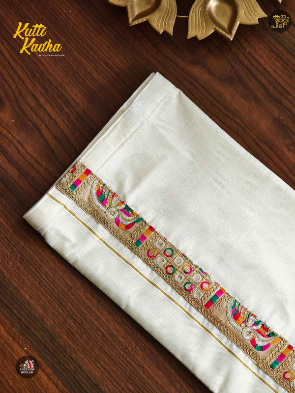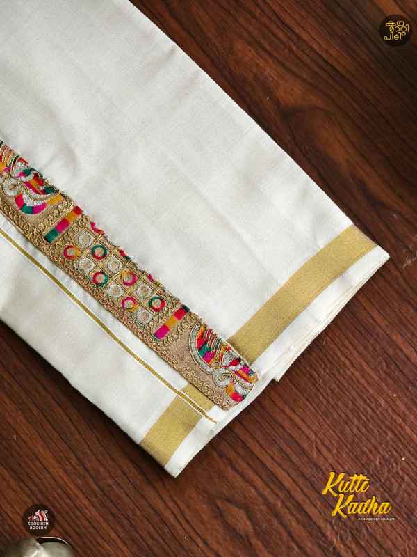 Add a touch of tradition and elegance to your child’s festive wardrobe with this beautifully crafted Kutty Kaadha Kasavu Mundu. Made from soft and breathable cotton, this white dhoti is adorned with a classic golden border and a striking Kathakali face embroidery in rich red and gold tones—symbolizing Kerala’s vibrant cultural heritage. Perfect for special occasions like Onam, Vishu, or temple visits, this dhoti ensures both comfort and style for your little one.