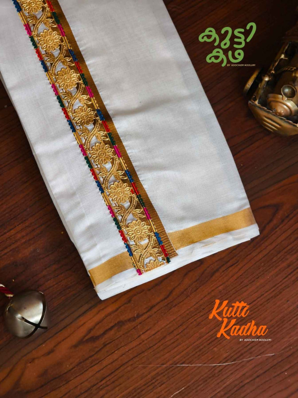 A refined take on tradition, this elegant white Kasavu mundu is elevated with a striking handcrafted central border. The pristine off-white fabric is complemented by a rich golden kasavu edge, while the highlight lies in the vibrant multicolour woven detailing running down the center—an artistic blend of heritage craftsmanship and contemporary charm.