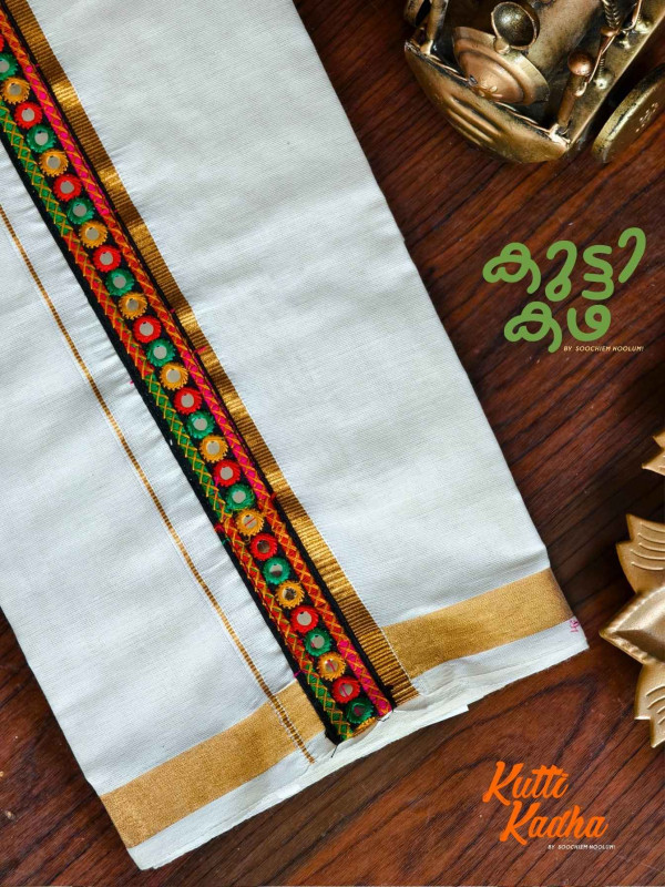 A refined take on tradition, this elegant white Kasavu mundu is elevated with a striking handcrafted central border. The pristine off-white fabric is complemented by a rich golden kasavu edge, while the highlight lies in the vibrant multicolour woven detailing running down the center—an artistic blend of heritage craftsmanship and contemporary charm.