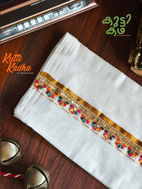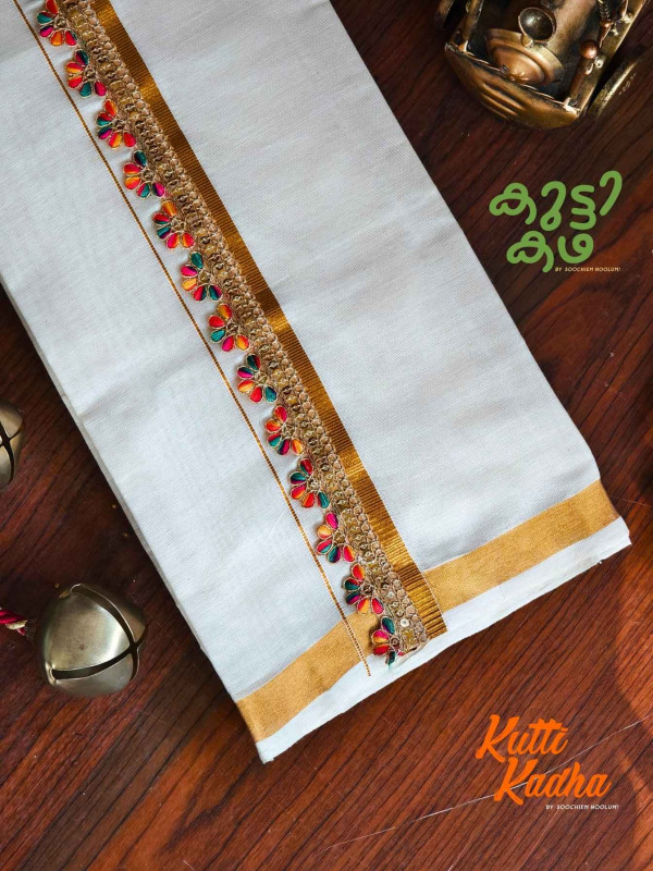 A refined take on tradition, this elegant white Kasavu mundu is elevated with a striking handcrafted central border. The pristine off-white fabric is complemented by a rich golden kasavu edge, while the highlight lies in the vibrant multicolour woven detailing running down the center—an artistic blend of heritage craftsmanship and contemporary charm.
