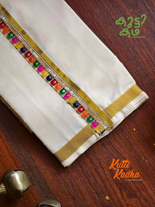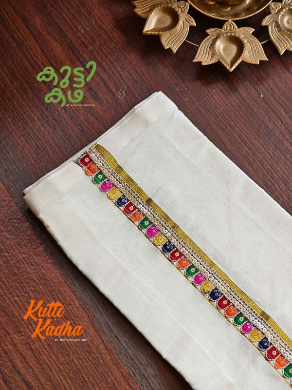 A refined take on tradition, this elegant white Kasavu mundu is elevated with a striking handcrafted central border. The pristine off-white fabric is complemented by a rich golden kasavu edge, while the highlight lies in the vibrant multicolour woven detailing running down the center—an artistic blend of heritage craftsmanship and contemporary charm.