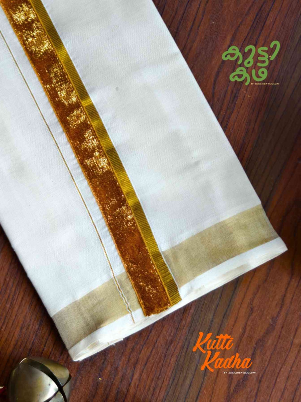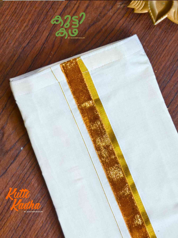 A refined take on tradition, this elegant white Kasavu mundu is elevated with a striking handcrafted central border. The pristine off-white fabric is complemented by a rich golden kasavu edge, while the highlight lies in the vibrant multicolour woven detailing running down the center—an artistic blend of heritage craftsmanship and contemporary charm.