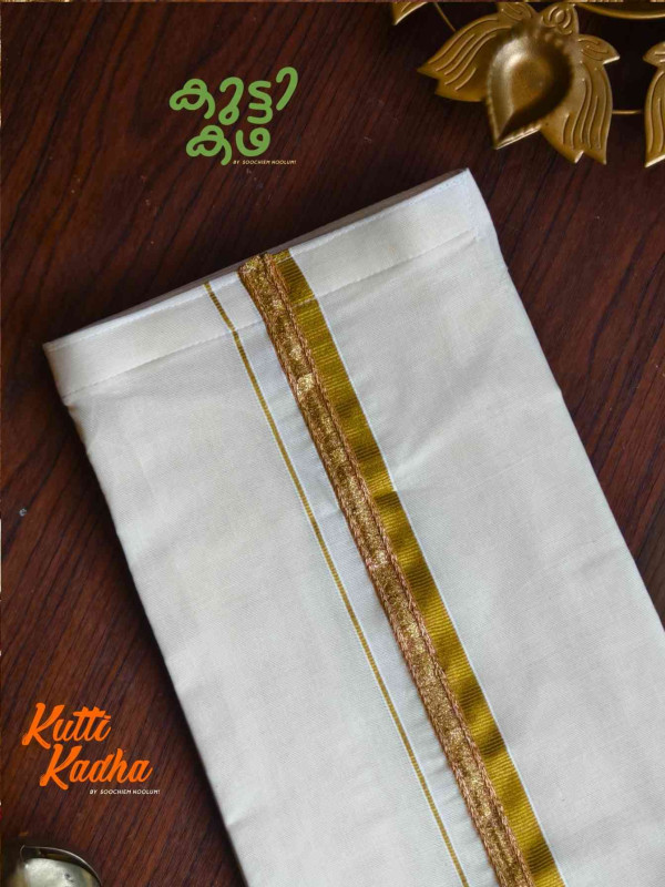 A refined take on tradition, this elegant white Kasavu mundu is elevated with a striking handcrafted central border. The pristine off-white fabric is complemented by a rich golden kasavu edge, while the highlight lies in the vibrant multicolour woven detailing running down the center—an artistic blend of heritage craftsmanship and contemporary charm.