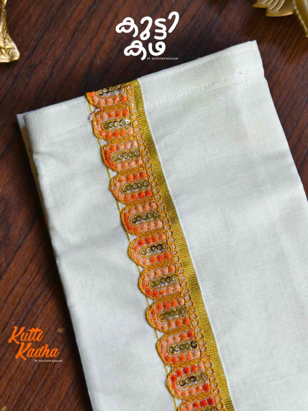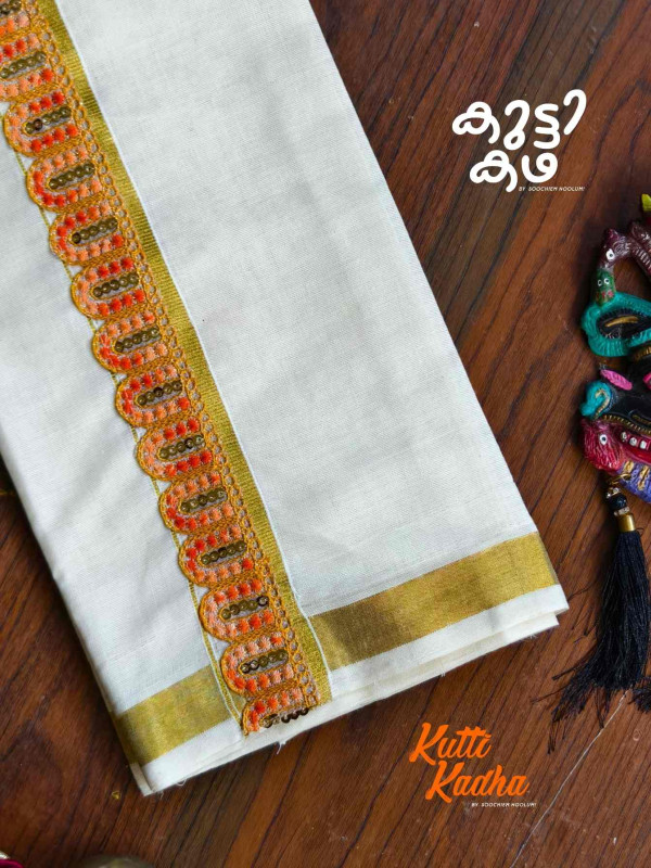 A refined take on tradition, this elegant white Kasavu mundu is elevated with a striking handcrafted central border. The pristine off-white fabric is complemented by a rich golden kasavu edge, while the highlight lies in the vibrant multicolour woven detailing running down the center—an artistic blend of heritage craftsmanship and contemporary charm.