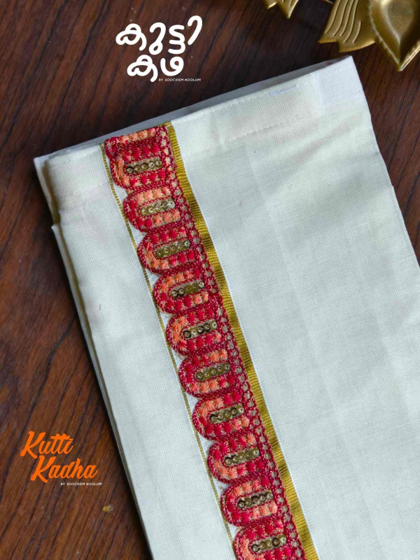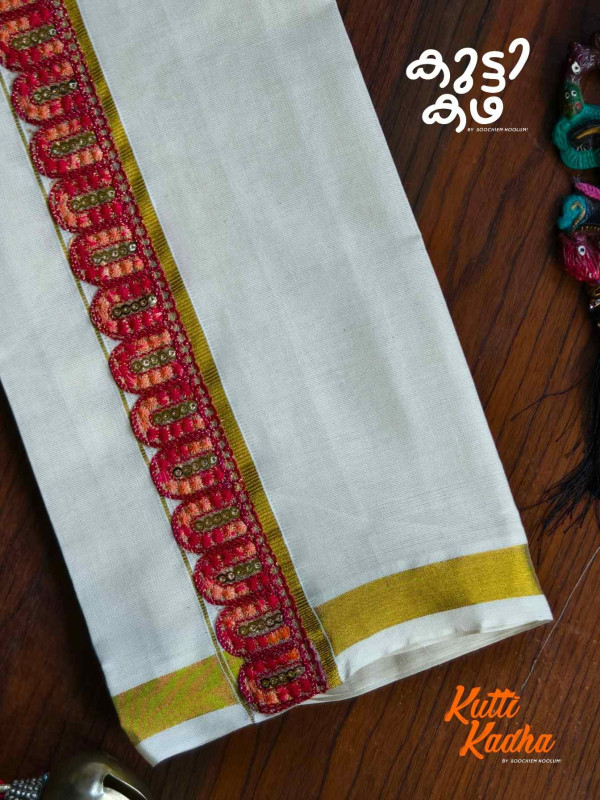 A refined take on tradition, this elegant white Kasavu mundu is elevated with a striking handcrafted central border. The pristine off-white fabric is complemented by a rich golden kasavu edge, while the highlight lies in the vibrant multicolour woven detailing running down the center—an artistic blend of heritage craftsmanship and contemporary charm.