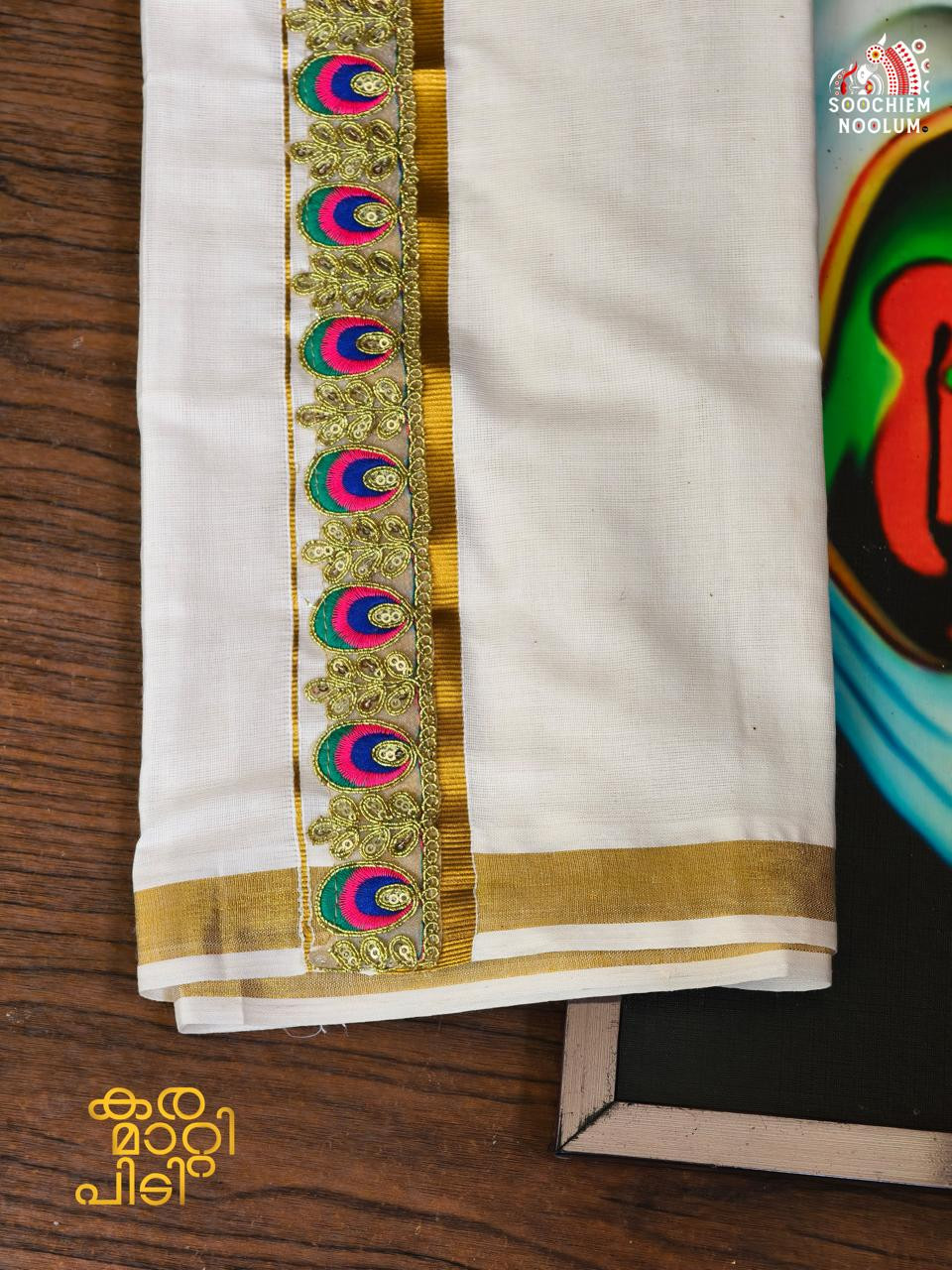 A refined take on tradition, this elegant white Kasavu mundu is elevated with a striking handcrafted central border. The pristine off-white fabric is complemented by a rich golden kasavu edge, while the highlight lies in the vibrant multicolour woven detailing running down the center—an artistic blend of heritage craftsmanship and contemporary charm.