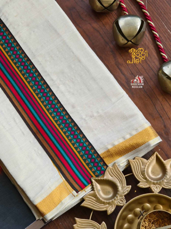 Product Specifications: Multi Colour Embroidery Golden Kasavu Single Dhoti