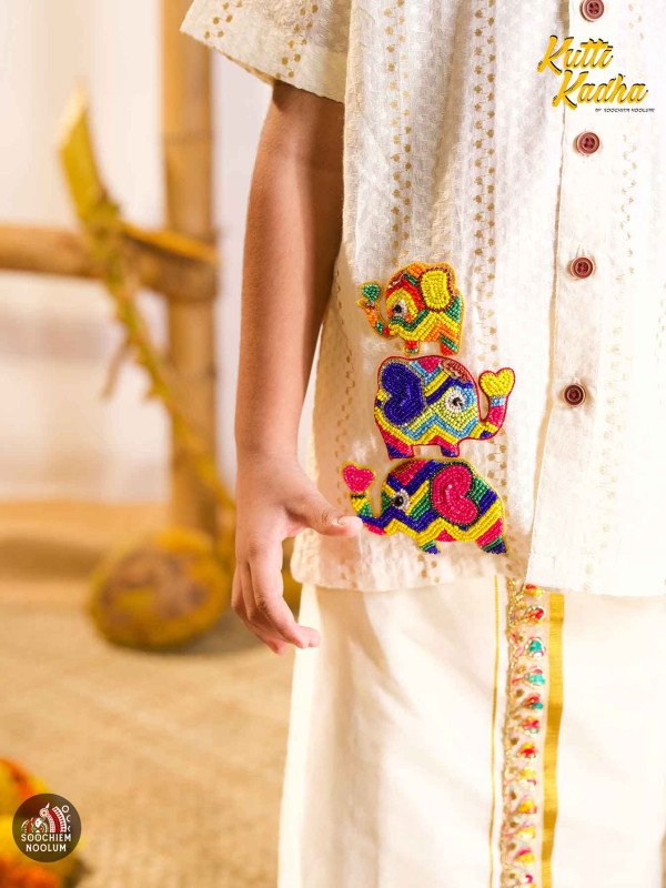Introducing MOONNU AANA(3 Elephant), a playful and stylish beige color Elephant Beaded Patch Shirt for kids from Kutti Kadha by Soochiem Noolum. Crafted from soft beige color cotton lurex fabric, this charming shirt features exquisite swaroski beaded work, highlighted by delightful three elephant patches that showcase a mischievous charm.