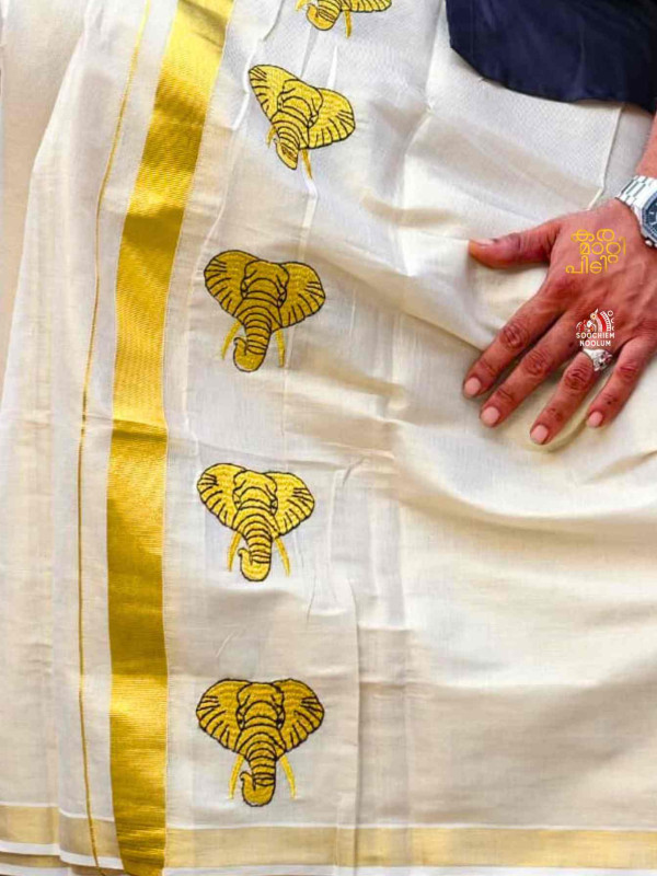 Premium Embroidery Elephant Design - Tissue Golden Kasavu Double Dhoti[DOUBLE00034]