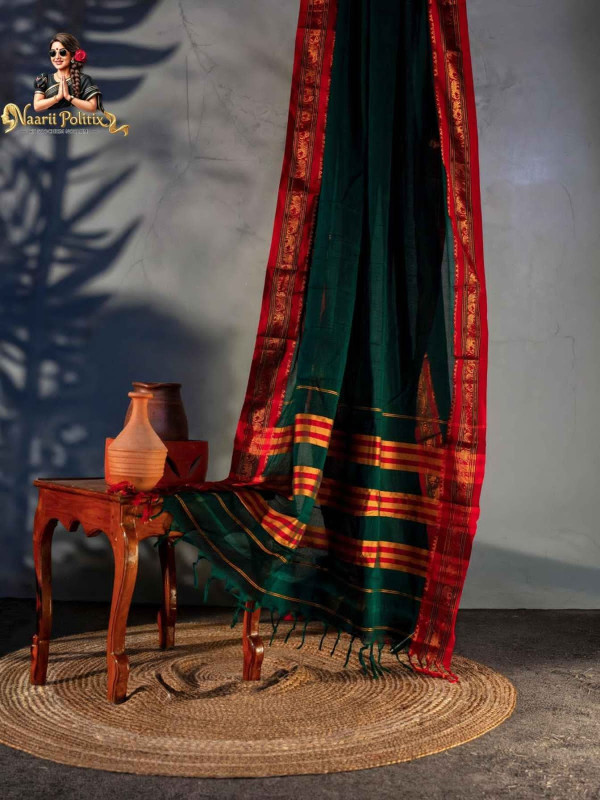 Its traditional color play and signature woven border detailing make this saree a timeless addition to any wardrobe.