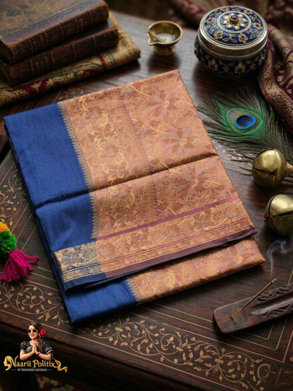 Color Palette: A striking contrast of Royal Blue on the body paired with a rich Copper-Gold and Mauve pallu and border.