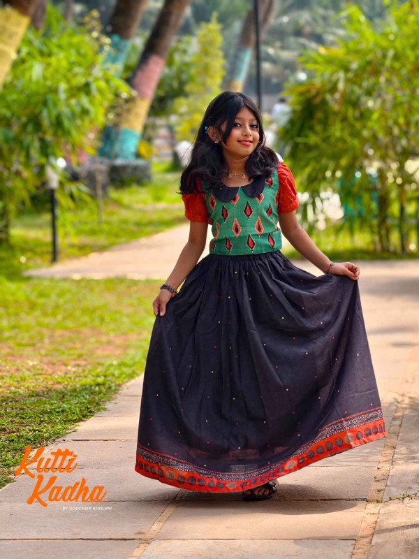 Introducing Nirakkoott, a delightful Gathered Skirt and Top collection from Kutti Kadha by Soochiem Noolum. Crafted from soft cotton fabric, this charming ensemble features intricate contemporary ikat patterns, enhancing its elegance and texture.