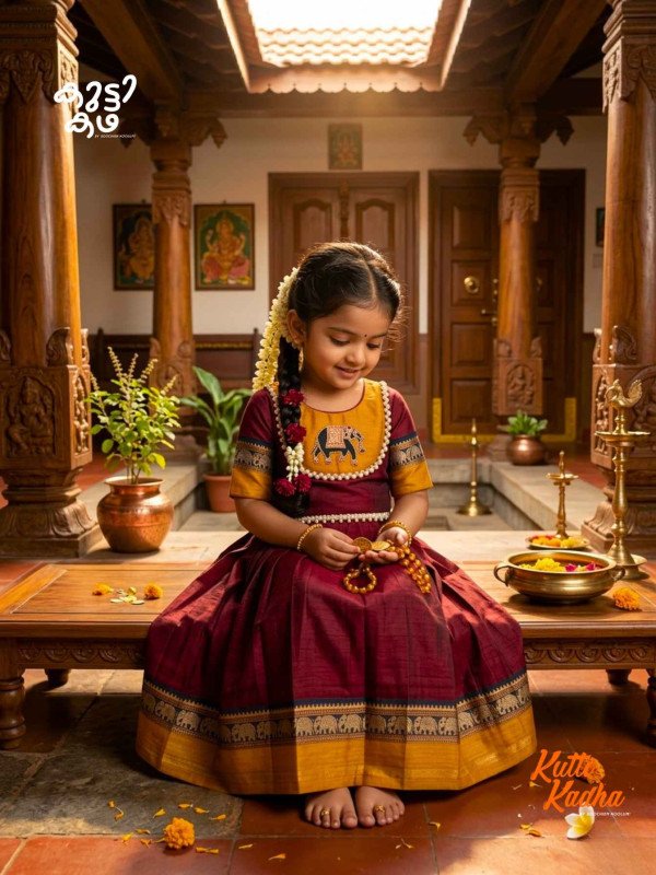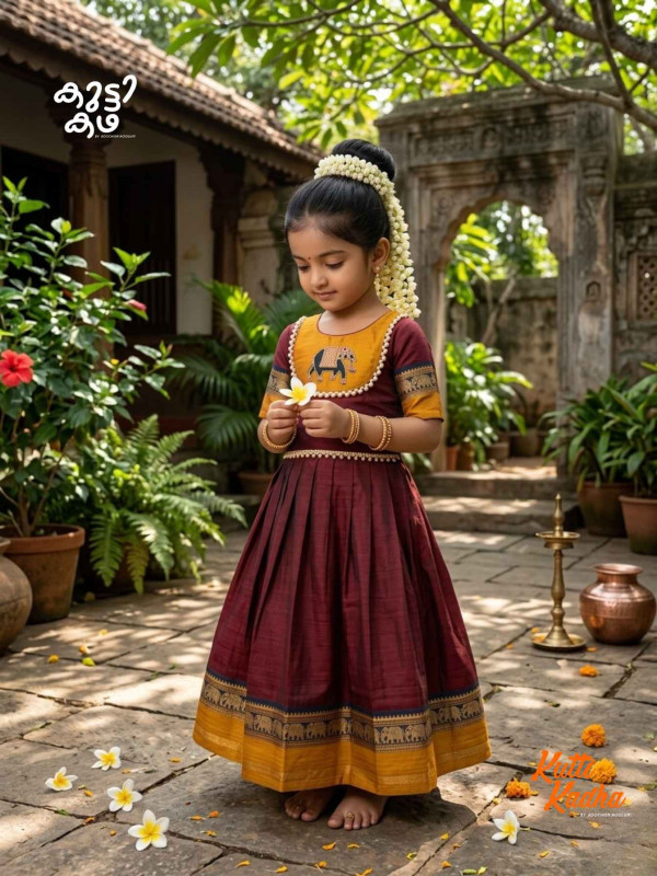 The rich maroon and mustard palette is inspired by classic Narayanpet weaves, enhanced with a delicate zari embroidery elephant patch on the top that adds a charming, heritage touch. The skirt features graceful pleats and a traditional woven border, creating a festive silhouette perfect for celebrations, functions, and special occasions.