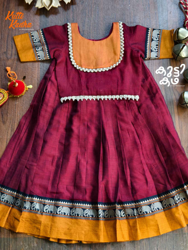The outfit features a stunning combination of deep tones accented with traditional zari borders, showcasing intricate motifs that reflect classic South Indian artistry. The structured top is enhanced with delicate detailing, while the flared skirt adds a graceful, twirl-worthy silhouette. A charming bow at the back completes the look with a touch of playful elegance.