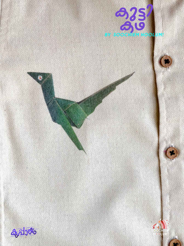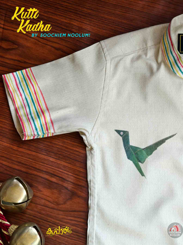 Step into a slice of childhood with OLAKKILI, a designer shirt from our nostalgic BALAN series. Part of the Kutti Kadha collection, this piece is a celebration of playful memories – of crafting parrot toys from coconut leaves, plucking fresh chethi, mandaram, and thulasi from our backyard garden, and chasing sun-drenched afternoons.