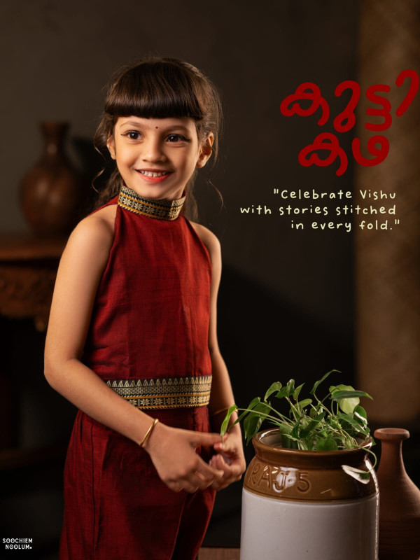 The rich Narayanpet-inspired weave in a deep maroon hue is beautifully accented with intricate borders, giving it a graceful, festive look. The sleeveless halter-style top features a delicate designer neckline and is complemented by a charming bow at the back, adding just the right hint of playful sophistication. The flared palazzo ensures ease of movement, making it ideal for both celebrations and carefree twirls.