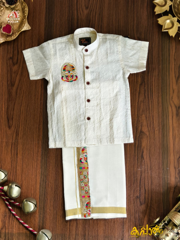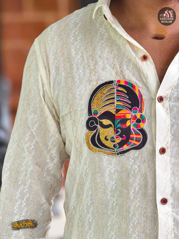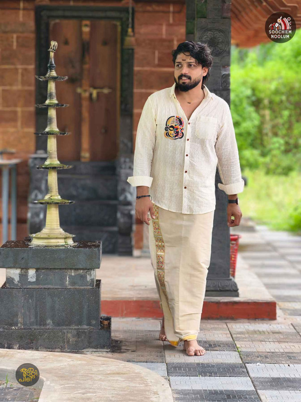 Crafted from premium breathable cotton, this designer combo features a classic shirt paired with a traditional Kasavu double dhoti. The highlight is the intricate Kathakali embroidery patch, inspired by Kerala’s iconic art form, adding a rich cultural touch to the ensemble. The shirt is tailored for a clean, comfortable fit with a mandarin collar and contrast buttons, while the Kasavu dhoti showcases a subtle golden border with elegant woven detailing.