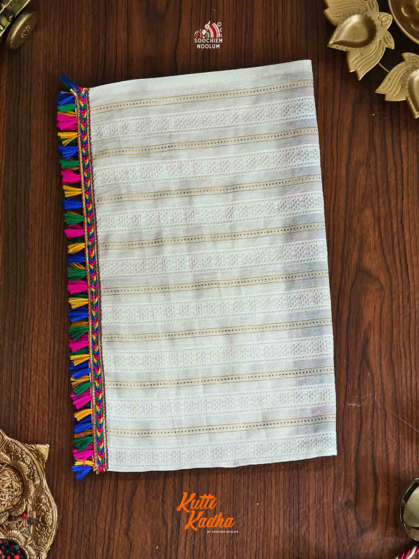 Celebrate tradition with a touch of divine charm! This elegant ivory white shirt is crafted from a rich jacquard fabric featuring intricate zig-zag patterns and wooden buttons that add a classic finish. The highlight is the adorable hand-embroidered Baby Krishna motif on the chest — perfect for festive occasions like Krishna Janmashtami or temple visits.