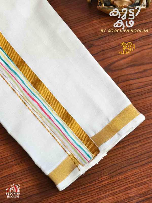 Introducing the vibrant Kids' Dhoti Collection by Kutti Kadha from Soochiem Noolum, specially crafted to blend tradition and comfort for energetic little ones. Each dhoti is meticulously designed from soft cotton fabric and beautifully adorned with colorful stitched borders and elegant embellishments, adding a playful charm to traditional attire.