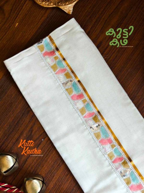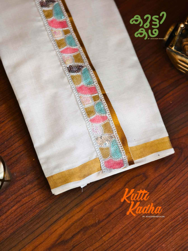 A refined take on tradition, this elegant white Kasavu mundu is elevated with a striking handcrafted central border. The pristine off-white fabric is complemented by a rich golden kasavu edge, while the highlight lies in the vibrant multicolour woven detailing running down the center—an artistic blend of heritage craftsmanship and contemporary charm.
