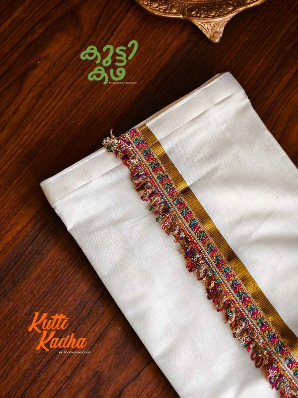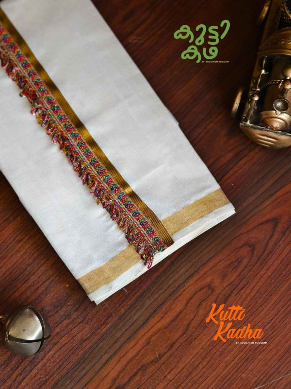 A refined take on tradition, this elegant white Kasavu mundu is elevated with a striking handcrafted central border. The pristine off-white fabric is complemented by a rich golden kasavu edge, while the highlight lies in the vibrant multicolour woven detailing running down the center—an artistic blend of heritage craftsmanship and contemporary charm.