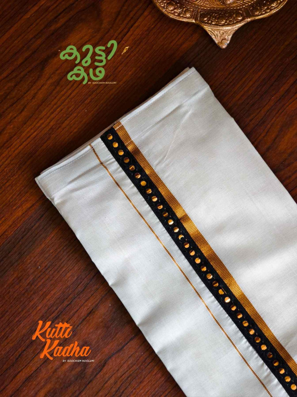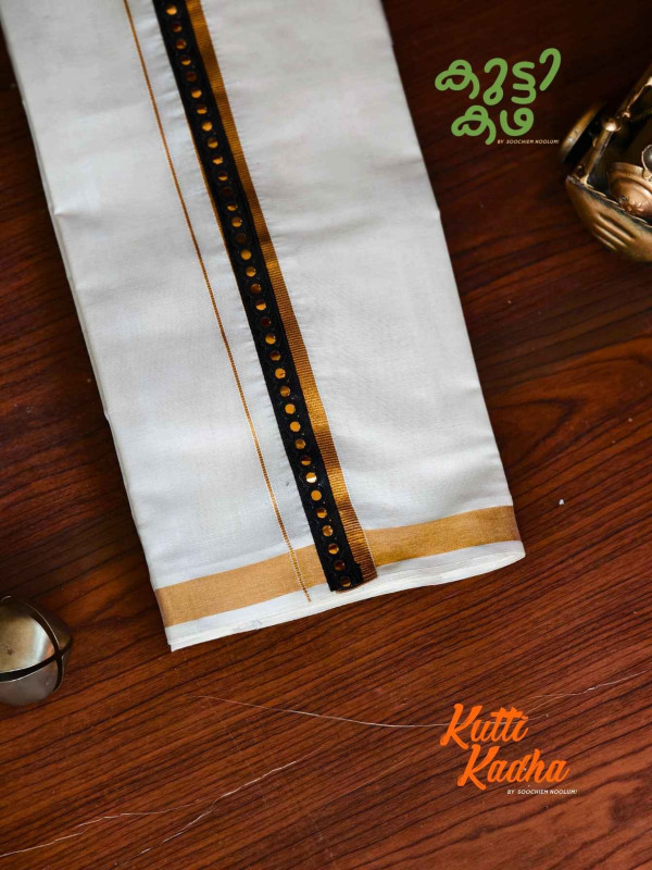A refined take on tradition, this elegant white Kasavu mundu is elevated with a striking handcrafted central border. The pristine off-white fabric is complemented by a rich golden kasavu edge, while the highlight lies in the vibrant multicolour woven detailing running down the center—an artistic blend of heritage craftsmanship and contemporary charm.