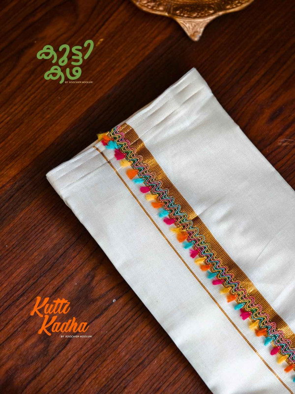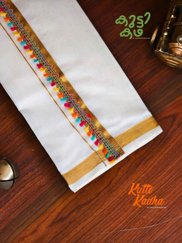 A refined take on tradition, this elegant white Kasavu mundu is elevated with a striking handcrafted central border. The pristine off-white fabric is complemented by a rich golden kasavu edge, while the highlight lies in the vibrant multicolour woven detailing running down the center—an artistic blend of heritage craftsmanship and contemporary charm.