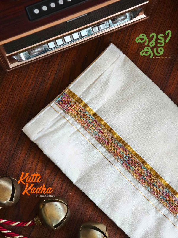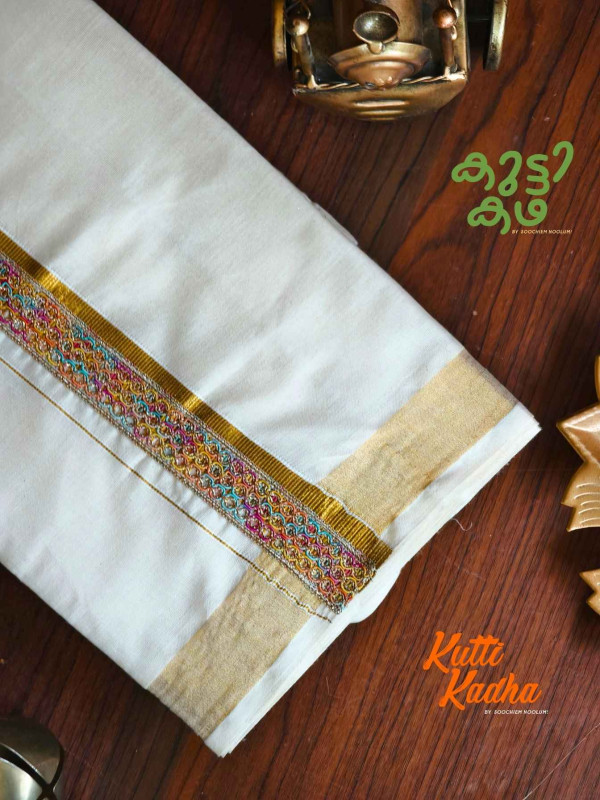 A refined take on tradition, this elegant white Kasavu mundu is elevated with a striking handcrafted central border. The pristine off-white fabric is complemented by a rich golden kasavu edge, while the highlight lies in the vibrant multicolour woven detailing running down the center—an artistic blend of heritage craftsmanship and contemporary charm.