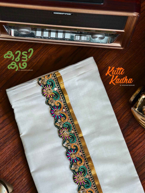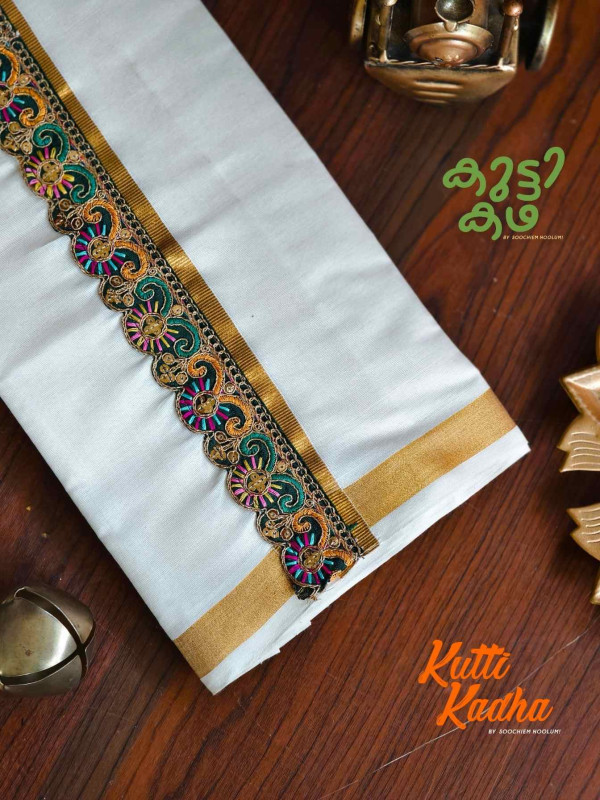 A refined take on tradition, this elegant white Kasavu mundu is elevated with a striking handcrafted central border. The pristine off-white fabric is complemented by a rich golden kasavu edge, while the highlight lies in the vibrant multicolour woven detailing running down the center—an artistic blend of heritage craftsmanship and contemporary charm.