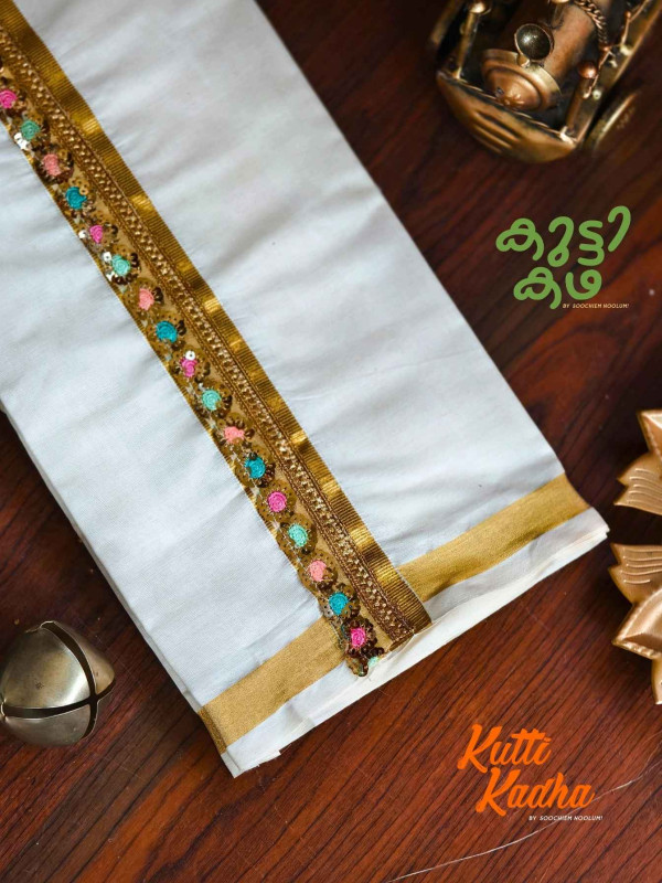 A refined take on tradition, this elegant white Kasavu mundu is elevated with a striking handcrafted central border. The pristine off-white fabric is complemented by a rich golden kasavu edge, while the highlight lies in the vibrant multicolour woven detailing running down the center—an artistic blend of heritage craftsmanship and contemporary charm.