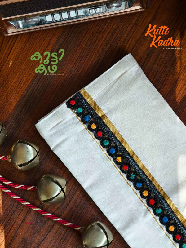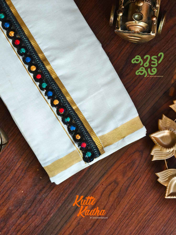 A refined take on tradition, this elegant white Kasavu mundu is elevated with a striking handcrafted central border. The pristine off-white fabric is complemented by a rich golden kasavu edge, while the highlight lies in the vibrant multicolour woven detailing running down the center—an artistic blend of heritage craftsmanship and contemporary charm.