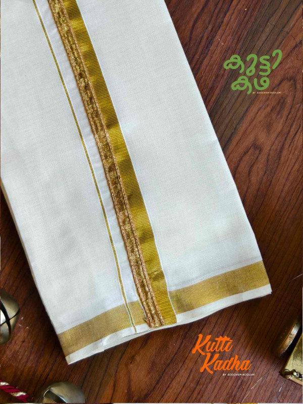 A refined take on tradition, this elegant white Kasavu mundu is elevated with a striking handcrafted central border. The pristine off-white fabric is complemented by a rich golden kasavu edge, while the highlight lies in the vibrant multicolour woven detailing running down the center—an artistic blend of heritage craftsmanship and contemporary charm.