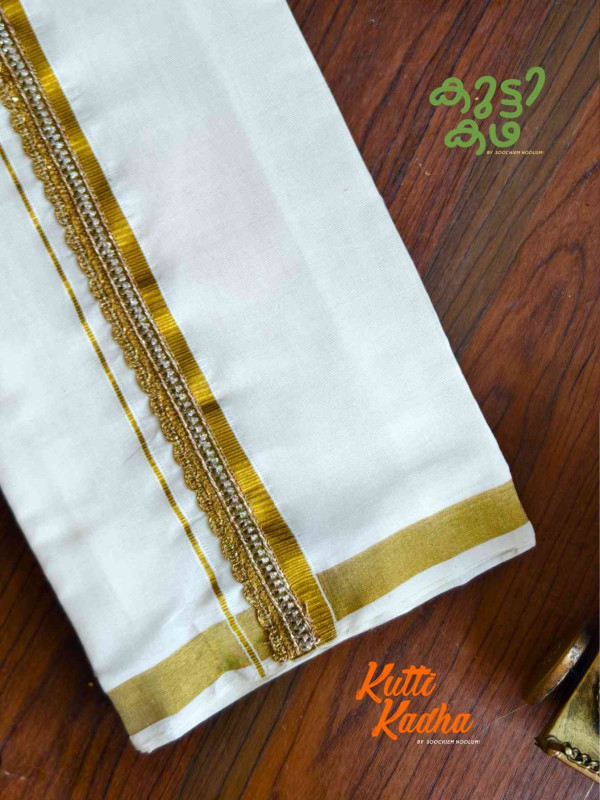 A refined take on tradition, this elegant white Kasavu mundu is elevated with a striking handcrafted central border. The pristine off-white fabric is complemented by a rich golden kasavu edge, while the highlight lies in the vibrant multicolour woven detailing running down the center—an artistic blend of heritage craftsmanship and contemporary charm.