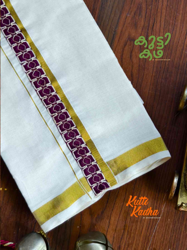 A refined take on tradition, this elegant white Kasavu mundu is elevated with a striking handcrafted central border. The pristine off-white fabric is complemented by a rich golden kasavu edge, while the highlight lies in the vibrant multicolour woven detailing running down the center—an artistic blend of heritage craftsmanship and contemporary charm.