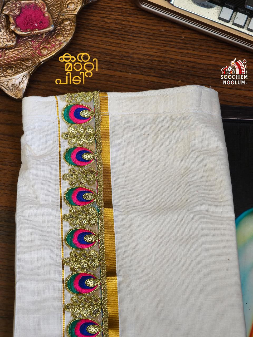 A refined take on tradition, this elegant white Kasavu mundu is elevated with a striking handcrafted central border. The pristine off-white fabric is complemented by a rich golden kasavu edge, while the highlight lies in the vibrant multicolour woven detailing running down the center—an artistic blend of heritage craftsmanship and contemporary charm.