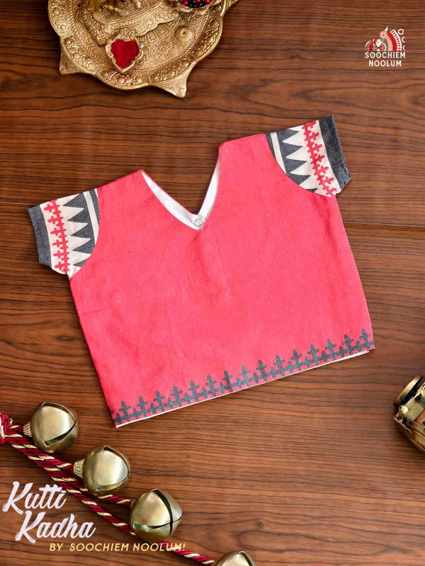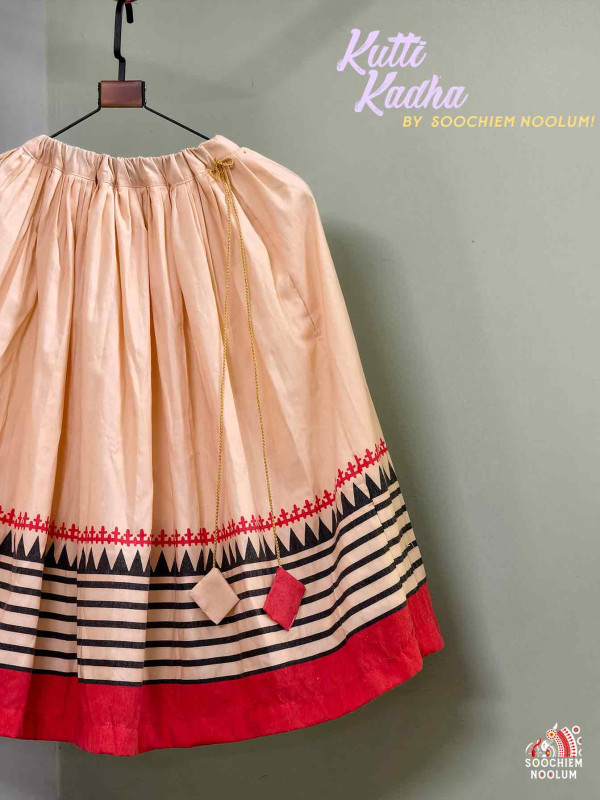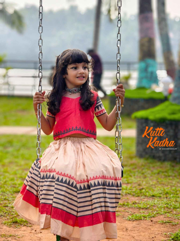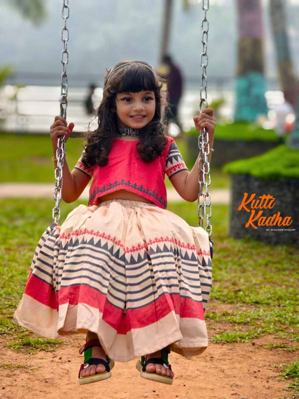 Introducing AAKRITI VIKRUTHI, an enchanting Geometric Printed Blouse and Skirt set from Kutti Kadha by Soochiem Noolum. This captivating ensemble combines classic elegance with a playful, mischievous twist, perfect for your little one's festive and special occasions.