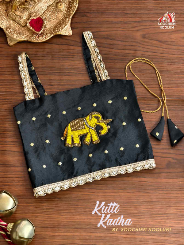 The exquisite blouse, made from premium taffeta silk, showcases delicate butta work across its soft, smooth fabric. At the center is a stunning, handcrafted elephant applique patch, intricately adorned with vibrant beads that add charm and elegance. This unique detail makes the blouse a standout piece, reflecting traditional motifs with a contemporary twist