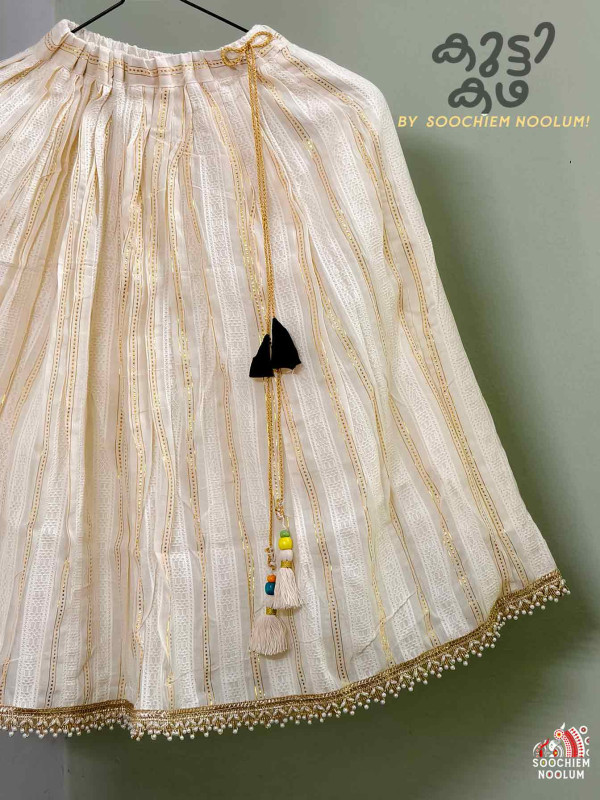 Paired perfectly with the blouse is an elegant ivory and golden cotton lurex skirt. The subtle sheen of the lurex threads provides a graceful sparkle, making it ideal for celebrations and special gatherings. Adding to its festive allure, the skirt features charming side tassels embellished with multi-colored beads, gently swaying with each joyful movement.
