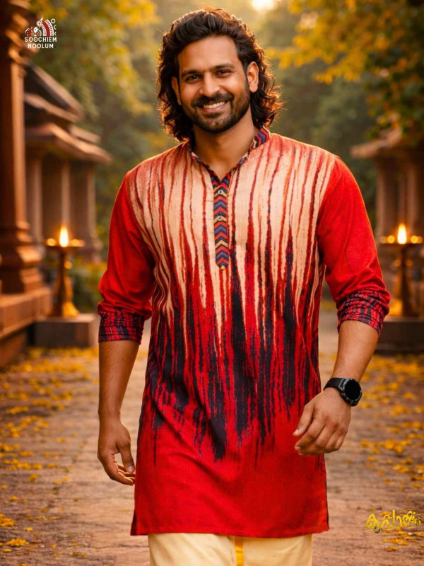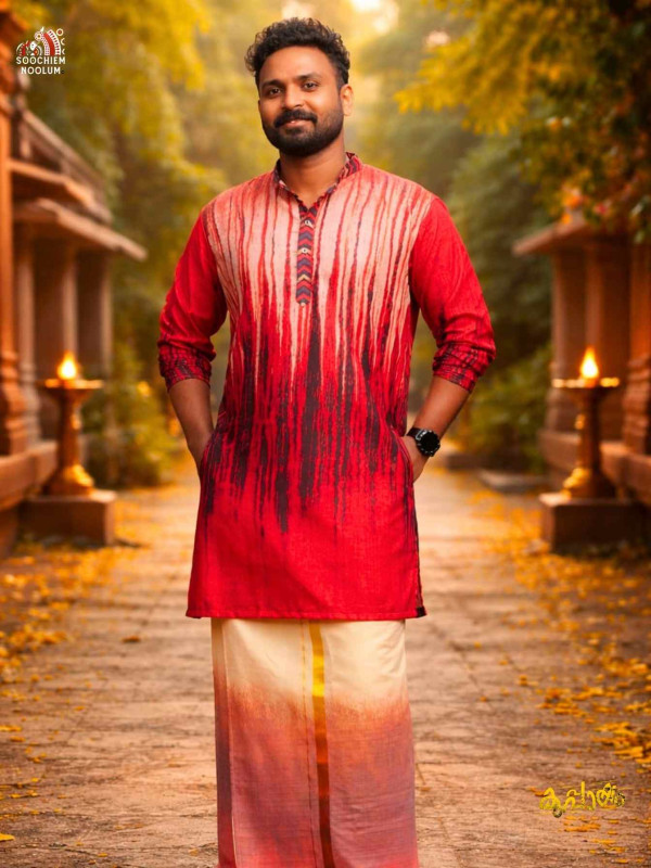 Vishu Special Premium Designer Kurta+ Ombre shade Designer Tissue Kasavu Dhoti Combo - Red [KURTACOMBO00054]