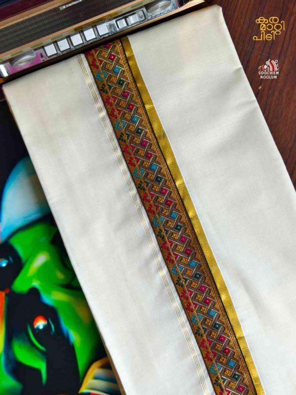 Stiched Border: Both end of the double kasavu dhotie is elegantly finished with a stitched border , adding a touch of sophistication and durability.
