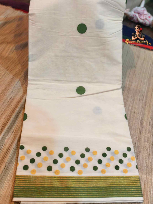 The soft off-white cotton base is adorned with hand block-printed polka dots in rich green and muted grey tones, while the pallu and lower border feature a graceful scattering of green and gold polkas. The highlight of this saree is its classic Kasavu-style border—woven in lustrous gold with deep green stripes—adding a refined and festive appeal.