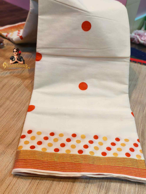 The highlight lies in its classic Kasavu-style border, adorned with rich golden zari stripes complemented by vibrant orange accents. The pallu is further enhanced with a striking combination of gold and orange woven detailing, adding a festive yet minimal appeal. The harmonious mix of warm orange polka dots and subtle golden motifs creates a balanced, eye-catching look perfect for both casual and semi-occasion wear.