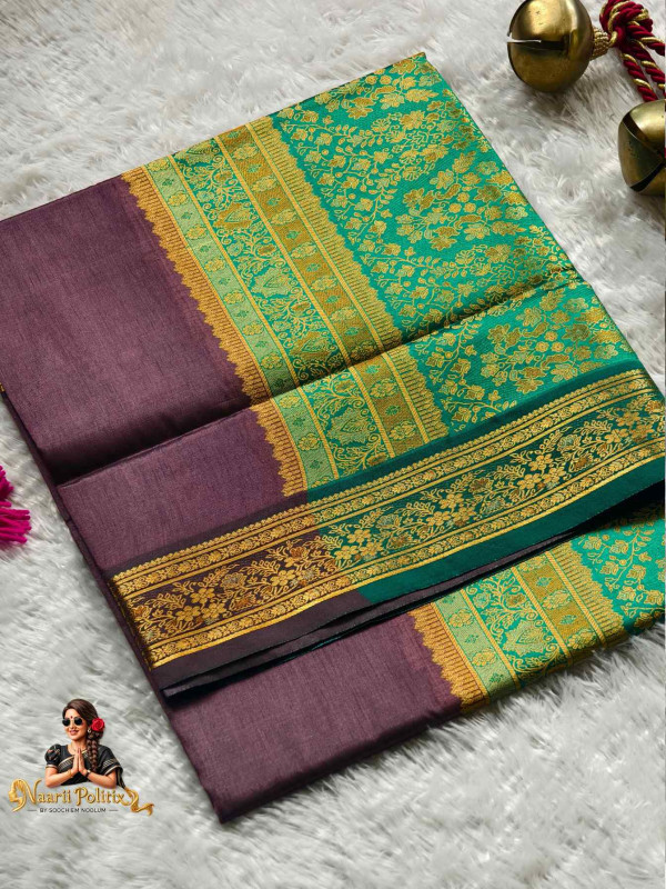 The deep mauve body provides a muted, elegant canvas that makes the bright emerald green and gold zari pop. The transition between the colors is marked by a delicate "temple" or Gopuram style weave, ensuring a seamless yet striking contrast that looks beautiful when draped.
