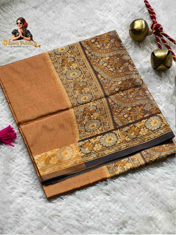 The subtle sheen of the butter silk enhances the depth of the earthy tone, while the detailed weaving along the border adds a regal finish that makes the saree truly stand out.