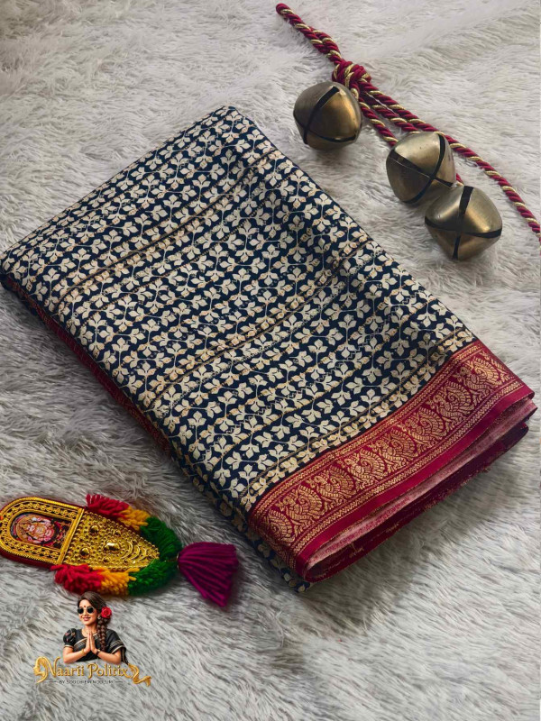 Celebrate timeless elegance with this beautifully crafted Checked Crepe Silk Saree, designed for women who appreciate classic artistry with a touch of cultural charm. The saree features a graceful deep navy blue base adorned with delicate cream floral motifs, creating a subtle yet striking pattern across the body.
