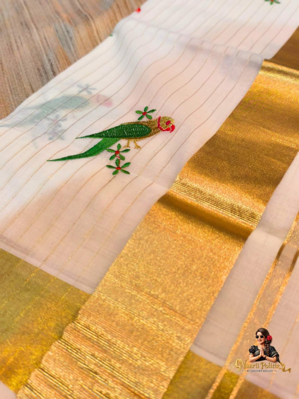 The highlight of this piece is the exquisite parrot embroidery—vivid green parrots with delicate red and gold accents perched on dainty floral vines, adding a refreshing pop of color and a touch of nature-inspired artistry. The rich golden kasavu border enhances its traditional appeal, making it perfect for festive occasions, cultural gatherings, or elegant day wear.