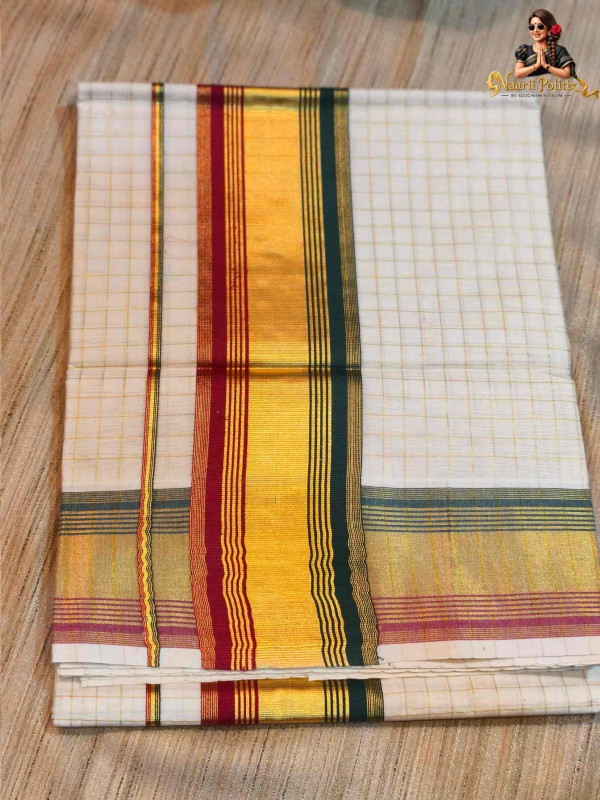 Border: Rich gold kasavu with dual-color stripes