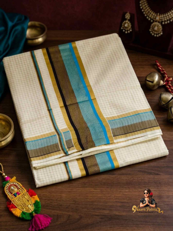 Weave: Lightweight micro-checked weave with traditional kasavu zari border