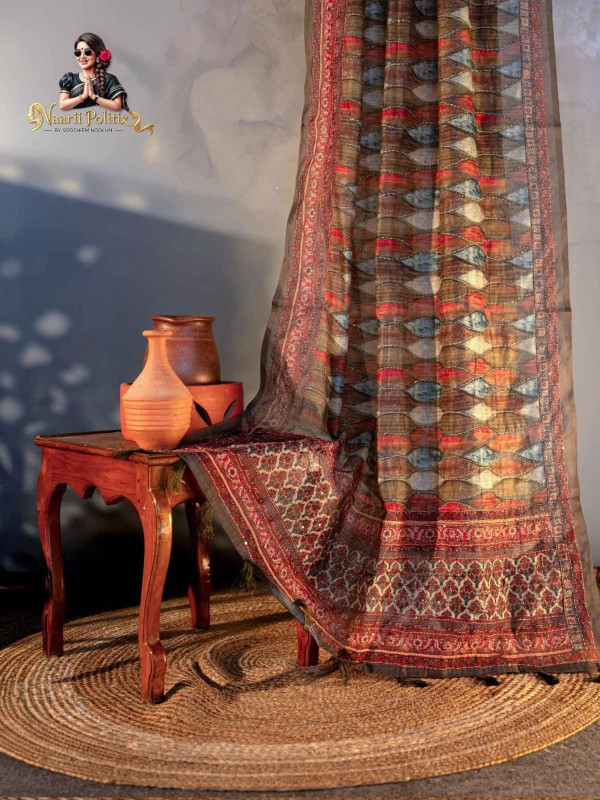 Design: Geometric and ethnic patterns across the body with a detailed, intricately woven border and pallu